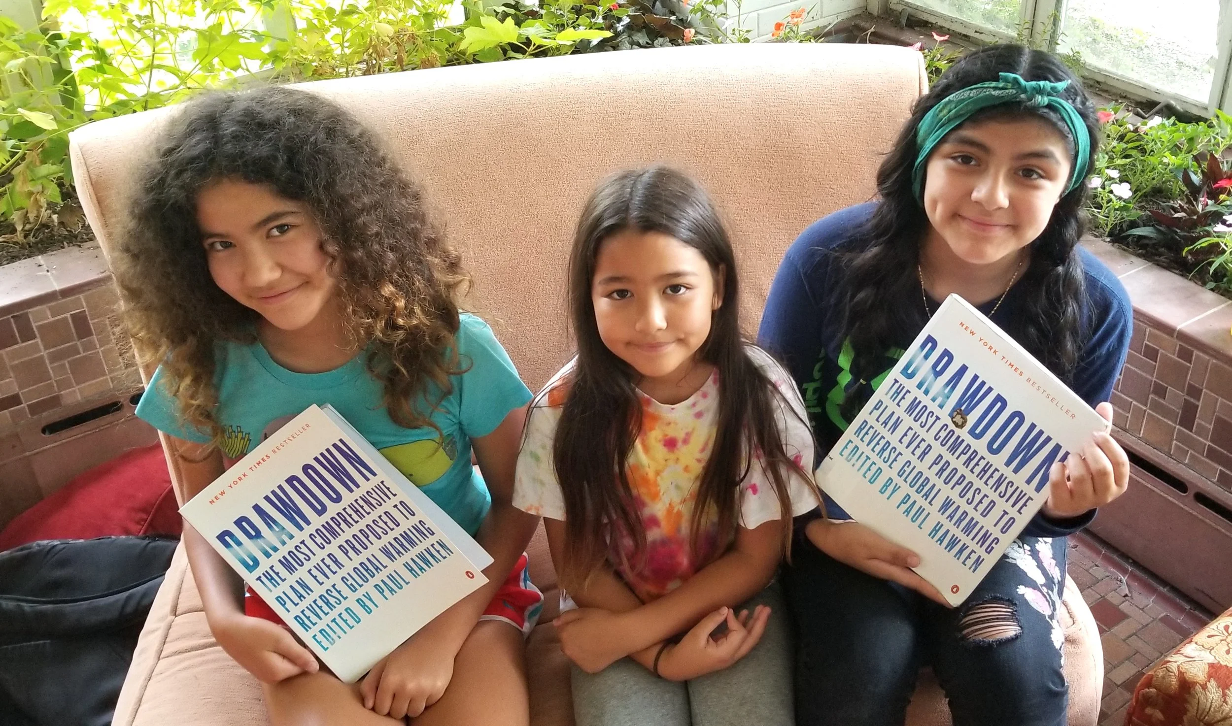 Hikari, Inori and Julianna study Drawdown at Climate Camp, July, 2018.