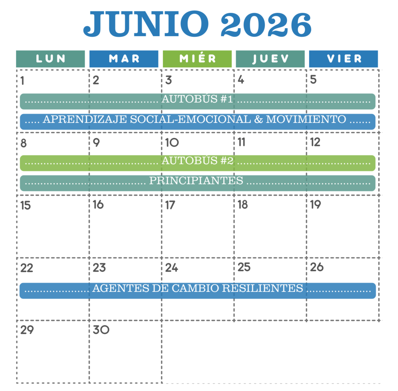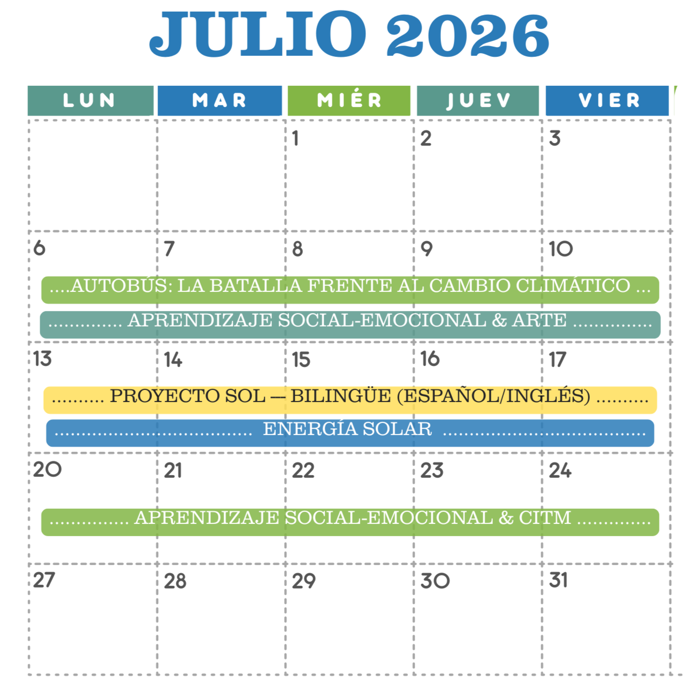 Los campistas pueden anticipar actividades acerca de la exploración al aire libre, expresión artística y cómo cuidar el bienestar de nuestro planeta, nuestra comunidad y nosotros mismos. El público meta para este campamento son los estudiantes que comunican principalmente en español y los estudiantes de hogares bilingües nativos.